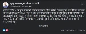 यसअघि क्षेत्र नम्बर २ बाट प्रत्यक्षतर्फ सरावगीको चर्चा चलेपनि मंगलवार उनले नै सामाजिक सञ्जाल फेसबुक पेजमार्फत सार्वजनिक गरेको पोस्टबाट यो कुरा बाहिर आएको हो । सोही पोस्टबाटै सरावगीको नाम प्रत्यक्ष मात्रै नभएर समानुपातिकमा पनि सिफारिस भएको खुलेको हो ।