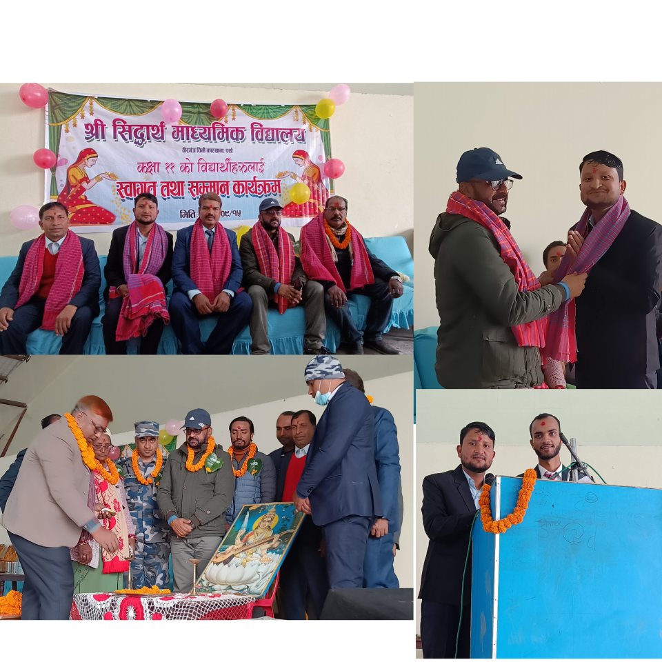 विशिष्ट अतिथि सशत्र प्रहरीका DSP मनोजचन्द्र ज्यू अतिथिमा बिधालयका सहायक-प्रधनाध्यापकदय प्रेमीशंकर रौनियार, रामअौधेस यादव ,ब्यवस्थापन समिती सदस्य श्रीमति कान्ति देबी, श्रीमति मधु राणा , देवलाल प्रसादको विशेष उपस्थितिमा पानस बालेर उद्दघाटन गरिएको हो । नेपाली आमा लाई सम्झिदै देशको राष्ट्रिय गीत बजाएर सो कार्यक्रमलाई अगाडि बढाइएको थियो । नृत्य संगीत,गीत, शायरी , नाटक जस्ता विशेष प्रस्तुतीको साथ स्वागत तथा सम्मान कार्यक्रम भब्य र सभ्य ढंगले उत्साहजनकको साथ मनोरञ्जन गर्दै समापन गरिएको हो । कक्षा १२ का विद्यार्थीहरुले कक्षा ११ मा अध्ययन गर्ने सम्पूर्ण विद्यार्थीहरुलाई खादा टीका लगाई भव्य रूपले उत्साहजनक का साथ स्वागत गरिएको हो।