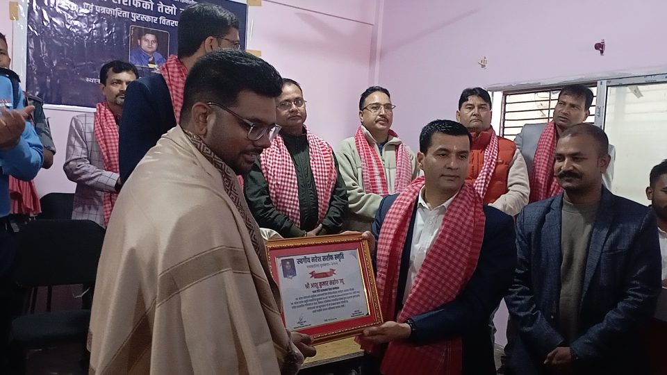 पर्सा – स्वर्गीय नरेश सर्राफको स्मृतिमा स्थापना गरिएको ‘स्व. नरेश सर्राफ स्मृति पत्रकारिता पुरस्कार’ यस वर्ष पत्रकार आशु सर्राफलाई प्रदान गरिएको छ। सोमबार नेपाल पत्रकार महासंघ पर्साको सभाहलमा आयोजित तेस्रो स्मृति सभामा उनलाई नगद २१ हजार रुपियाँसहित सम्मानपूर्वक पुरस्कृत गरिएको हो।