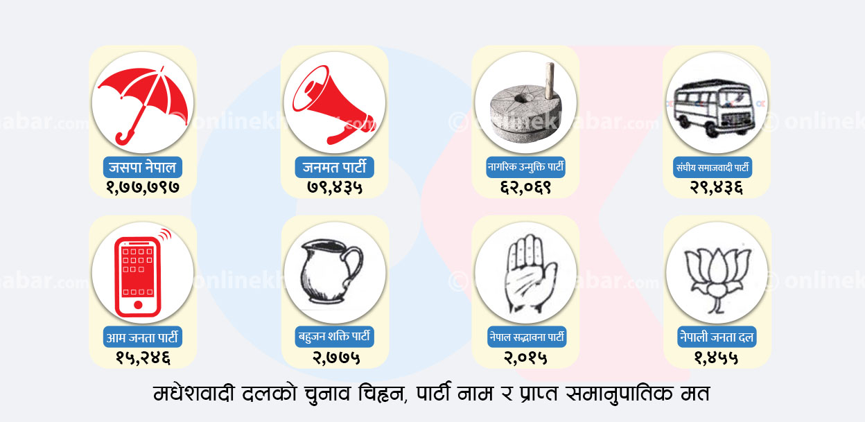 गत फागुनको निर्वाचनमा मधेश प्रदेशका ३२ मध्ये ३० क्षेत्रमा राष्ट्रिय स्वतन्त्र पार्टी (रास्वपा)ले जित निकाल्दा मधेशवादी दलहरू कमजोर बने। रास्वपा १३ लाख मतसहित पहिलो दल बन्न सफल भयो भने जसपा नेपाल चौथो र जनमत पार्टी पाँचौं स्थानमा खुम्चिए।